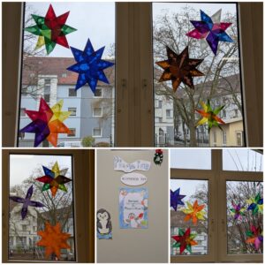 Ende November bastelten wie gemeinsam mit einigen Helfern Sterne für unsere Fenster. Diese leuchten jetzt jeden Tag bunt in unserem Klassenraum.