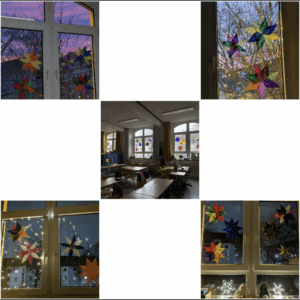 Ende November bastelten wie gemeinsam mit einigen Helfern Sterne für unsere Fenster. Diese leuchten jetzt jeden Tag bunt in unserem Klassenraum.